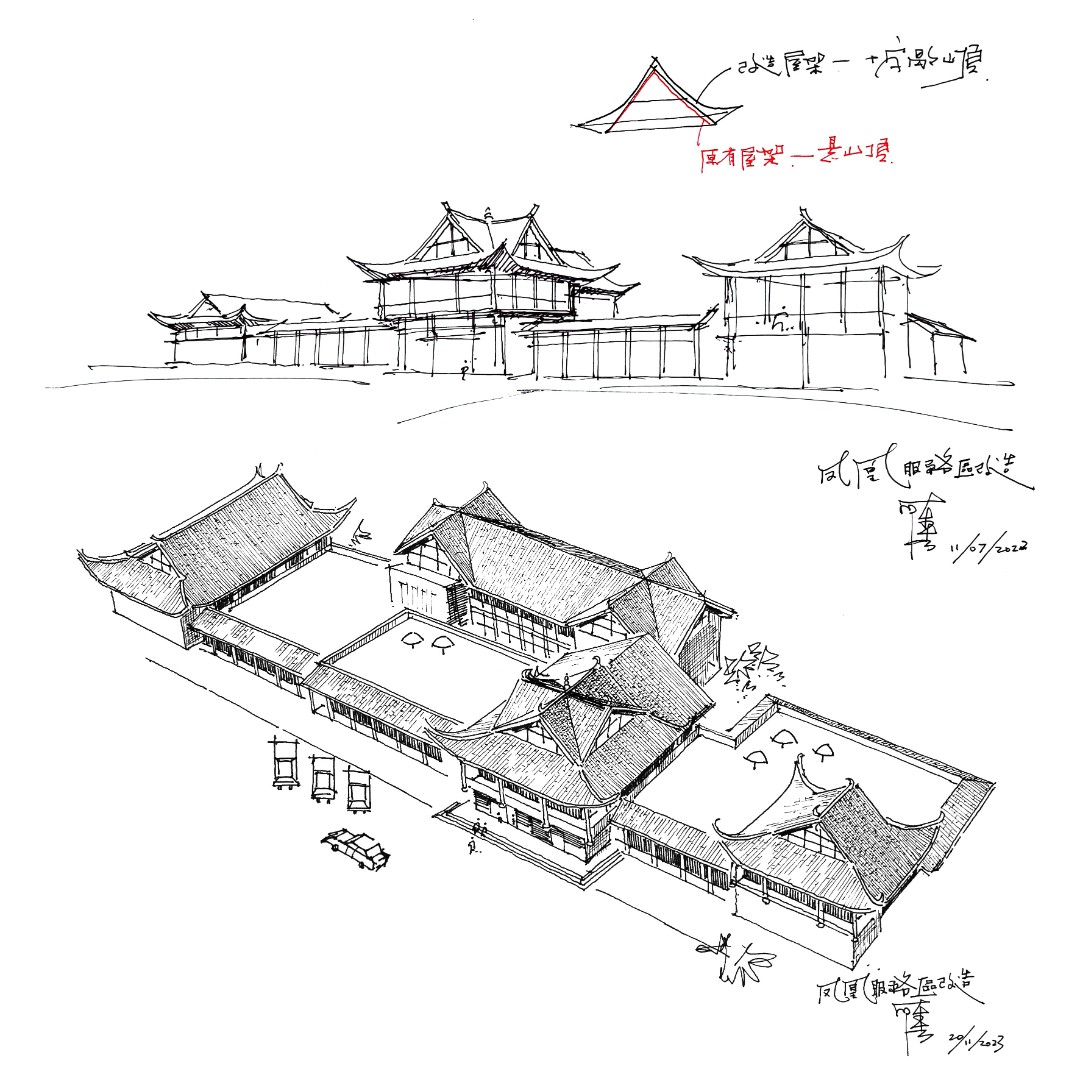 服務區建筑立面的改造設計為項目一大亮點。設計團隊深入挖掘當地傳統民居元素,通過歇山頂屋架形式和飛檐翹角等傳統構造彰顯苗寨風情,使服務區在保持現代服務功能便捷性、舒適性的同時,又充滿了吊樓古韻、水鄉風情的地域特色。