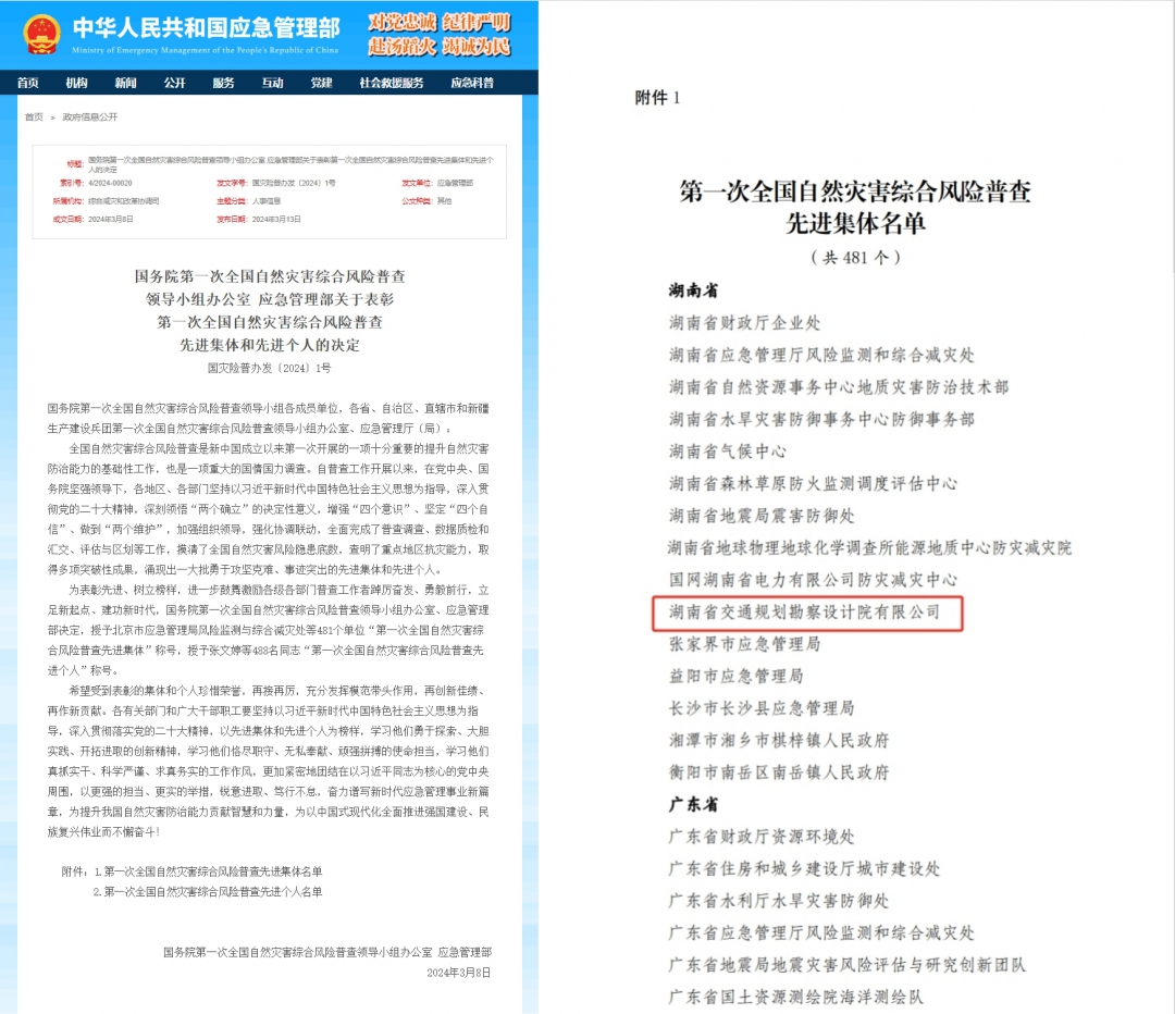 日前,國務院第一次全國自然災害綜合風險普查領導小組辦公室、應急管理部發布“第一次全國自然災害綜合風險普查先進集體和先進個人”名單,湖南交通設計院被授予“第一次全國自然災害綜合風險普查先進集體”榮譽稱號。 2020年5月,國務院辦公廳印發《關于開展第一次全國自然災...